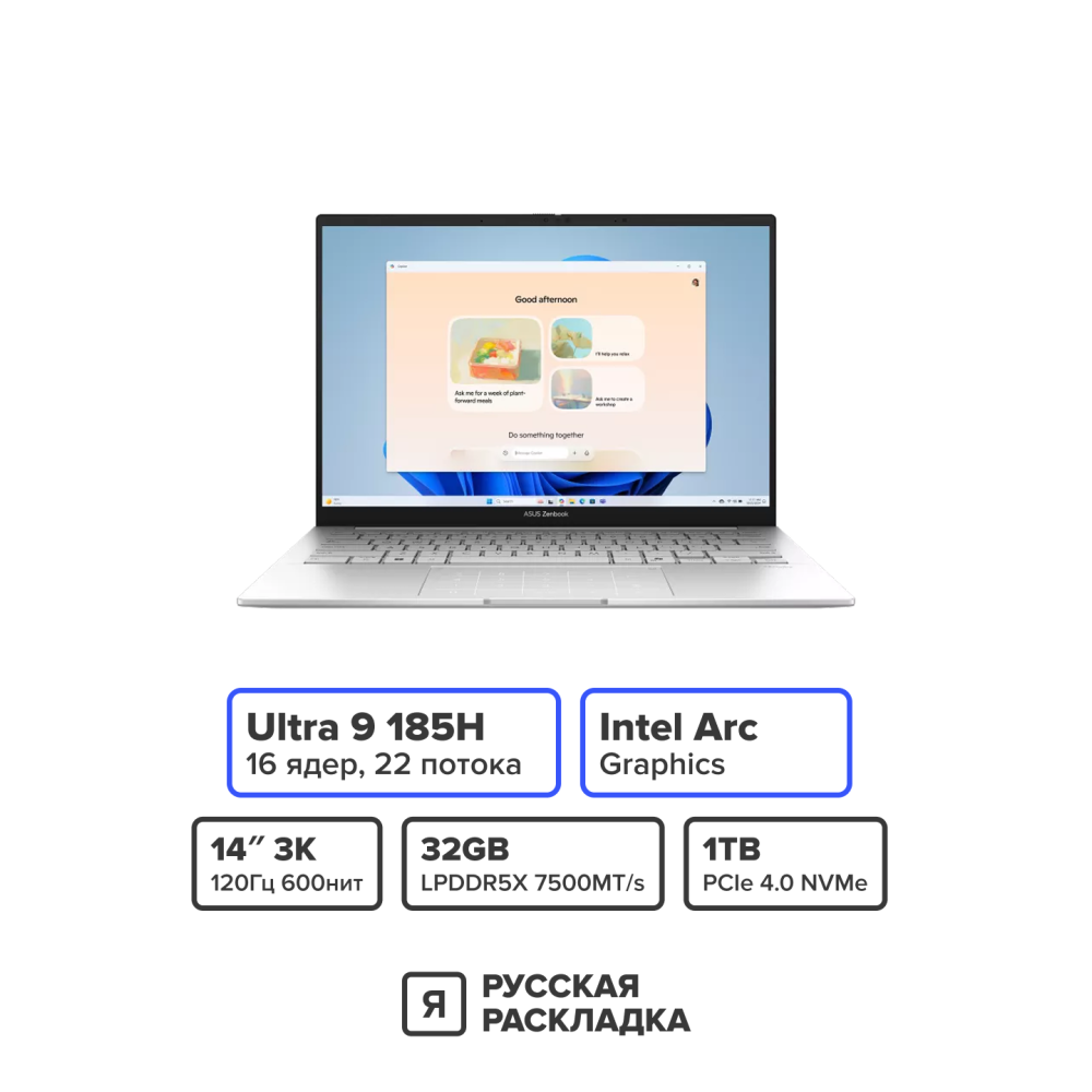 14" Ноутбук ASUS Zenbook 14 Ultra 9 185H OLED 2.8K 120Гц RAM 32 ГБ SSD 1 ТБ UX3405MA Серебристый 92 000 ₽