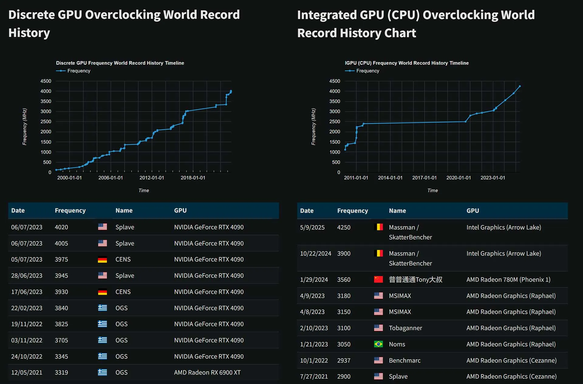 Предыдущий рекорд среди десктопных видеокарт принадлежит RTX 4090 и оверклокеру Splave — 4020 МГц. А в абсолютном зачёте оверлокеру SkatterBencher и «встройке» Intel Core Ultra 9 285K — 4250 МГц.