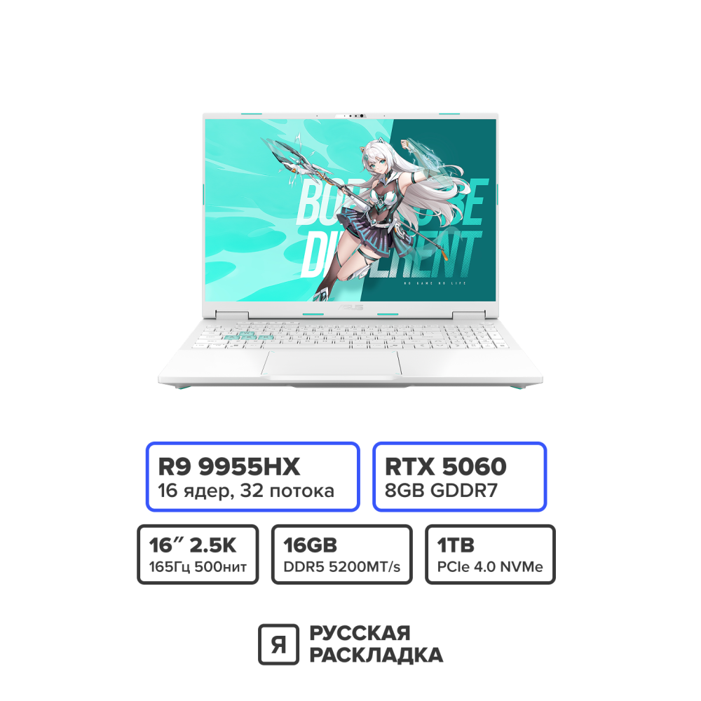 16" Игровой ноутбук ASUS TUF Gaming 6 Pro в стильном белом корпусе с синей крышкой — это сочетание передовой производительности и уникального дизайна. Процессор AMD Ryzen 9 9955HX архитектуры Zen 5 обеспечивает рекордную скорость в играх.