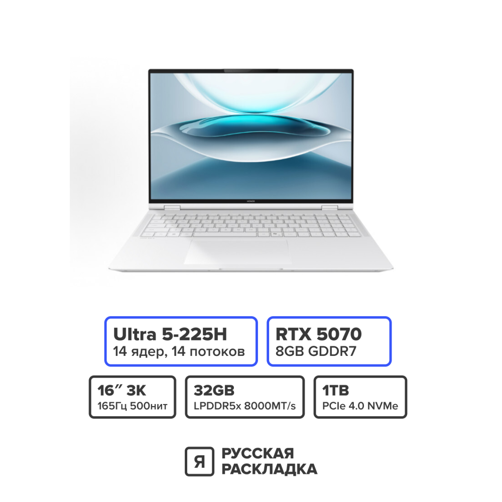 16" Игровой ноутбук Honor MagicBook Pro 16 в элегантном белом исполнении — это сочетание стильного дизайна и улучшенной производительности. Видеокарта NVIDIA GeForce RTX 5070 и процессор Intel Core Ultra 5 обеспечивают плавный гейминг в разрешении 3K.