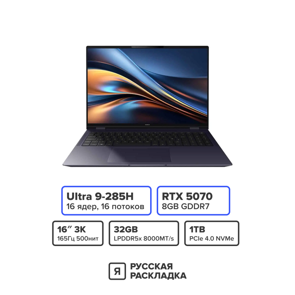 16" Игровой ноутбук Honor MagicBook Pro 16 в насыщенном синем исполнении — это воплощение флагманской производительности и стиля. Процессор Intel Core Ultra 9 285H и видеокарта NVIDIA RTX 5070 обеспечивают непревзойденную мощность для gaming и профессиональных задач.