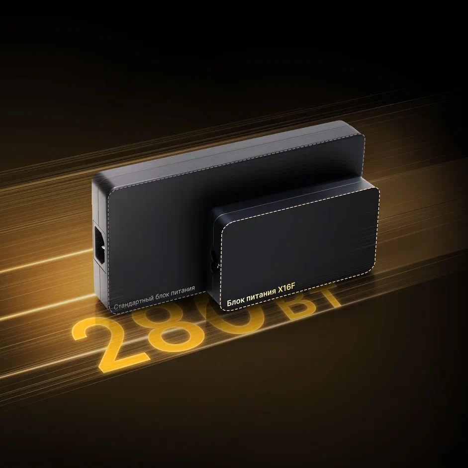 За автономную работу отвечает аккумулятор ёмкостью 80 Вт·ч, поддерживающий быструю зарядку. В комплект входит компактный блок питания мощностью 280 Вт, а для мобильного использования предусмотрена зарядка через USB Type-C мощностью до 140 Вт.