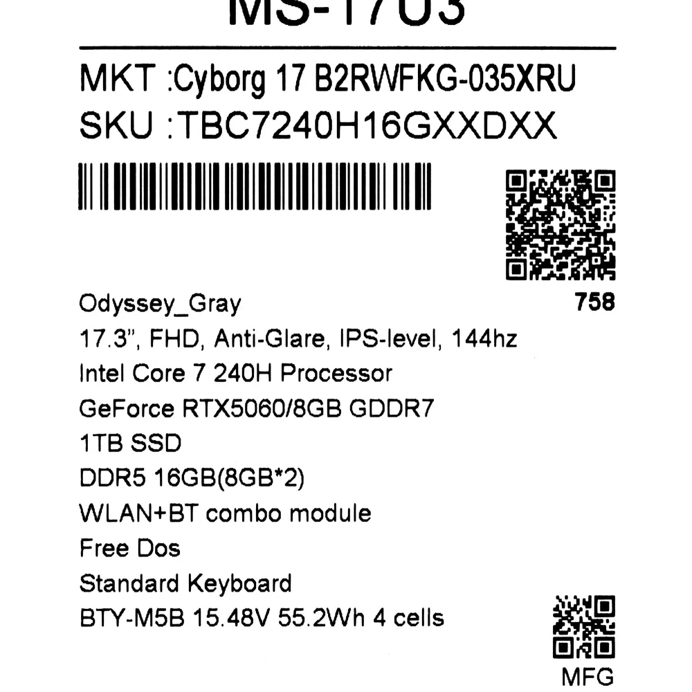 | Модель | MSI Cyborg 17 B2RWFKG-035XRU |