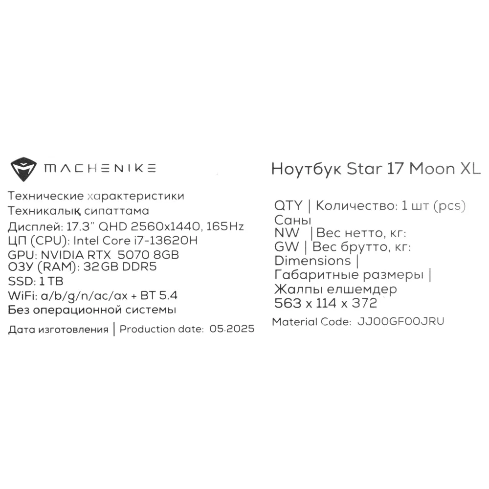 ПроизводительMachenike Тип ноутбуканоутбук МодельMachenike Star 17 Moon XL