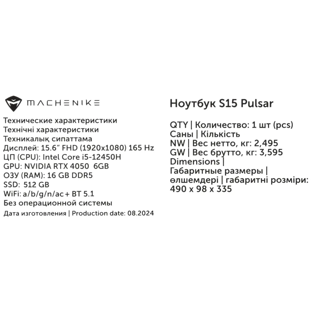 | ПроизводительMachenike | Тип ноутбуканоутбук | МодельMachenike S15 Pulsar |