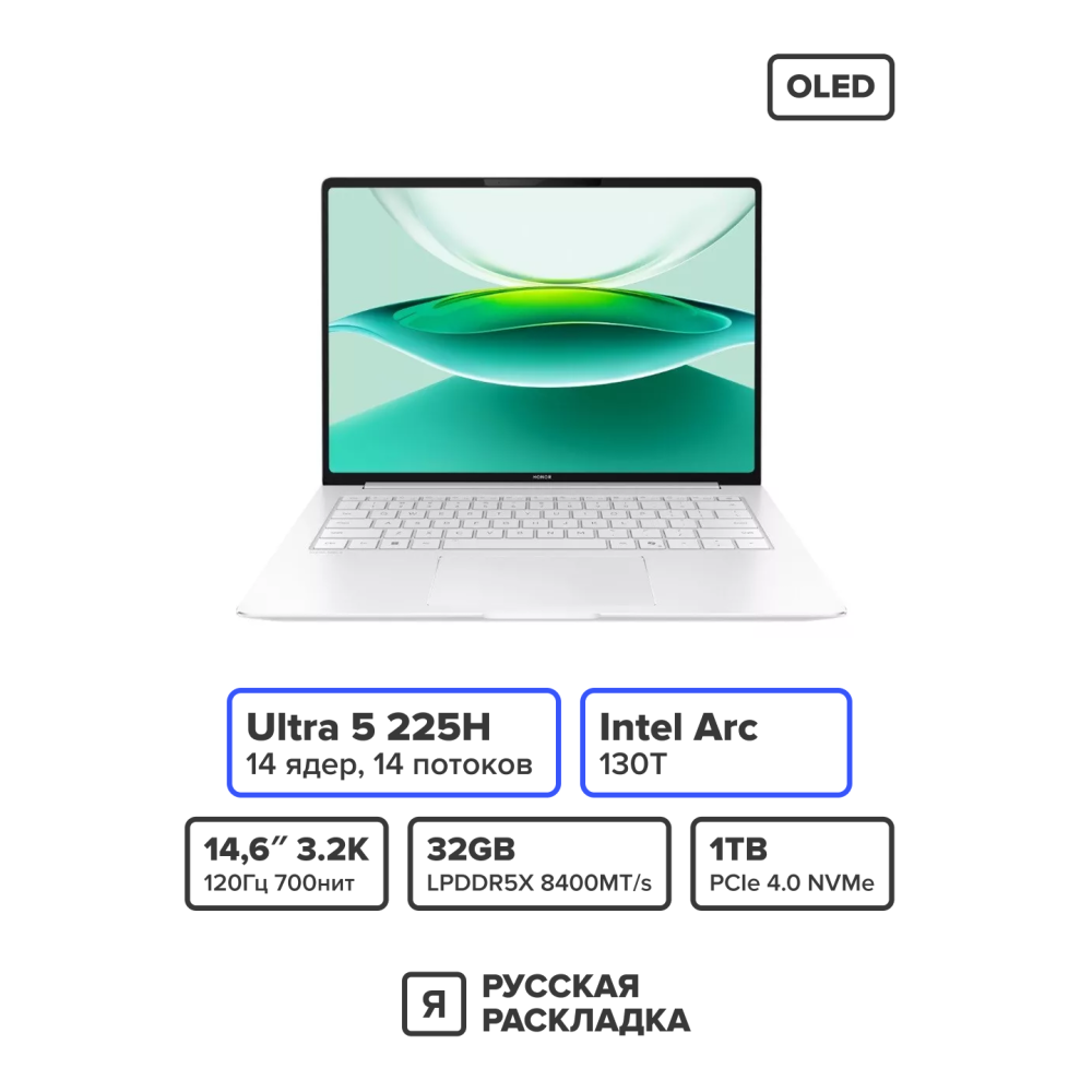 14.6" Ноутбук Honor MagicBook Pro 14 в элегантном белом исполнении — это гармония стильного дизайна и высокой производительности. Яркий OLED-дисплей и современный процессор создают идеальные условия для работы и развлечений.