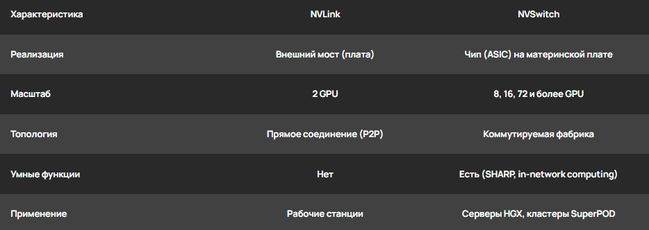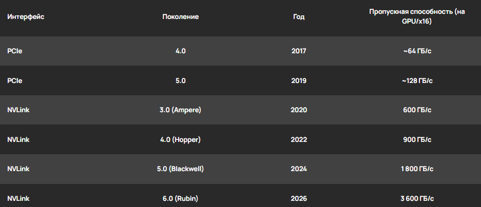 - Реализации: NVLink Bridge (2-way), NVSwitch (8-way), NVLink-C2C (суперчипы)