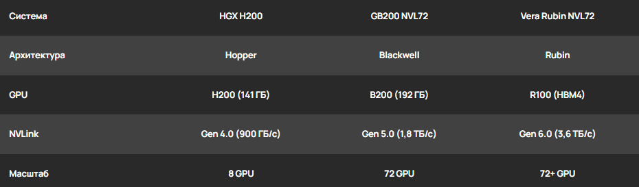 Перспективная платформа, релиз которой состоится в 2026 году. Будет оснащена NVLink 6.0 с пропускной способностью 3600 ГБ/с на чип. Система NVL72 на базе Rubin обеспечит агрегированную пропускную способность сети в 260 ТБ/с, что необходимо для агентского ИИ (Agentic AI), работающего в непрерывном цикле рассуждений.
