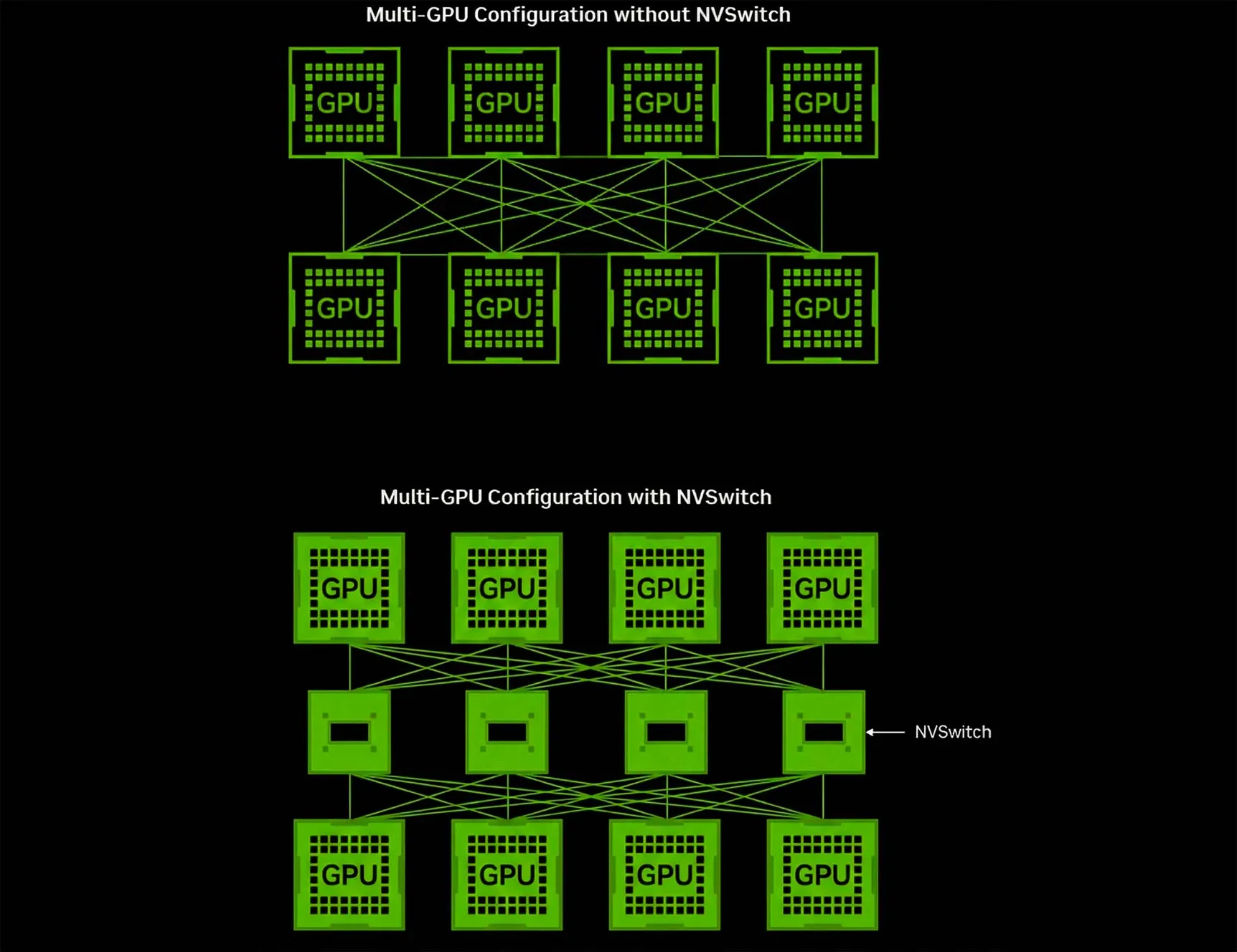 Вместо прямого соединения видеокарт друг с другом, каждый графический процессор подключается к чипам NVSwitch на системной плате. Это создаёт полносвязную (All-to-All) неблокируемую сеть. Любой процессор может передавать данные любому другому на полной скорости.