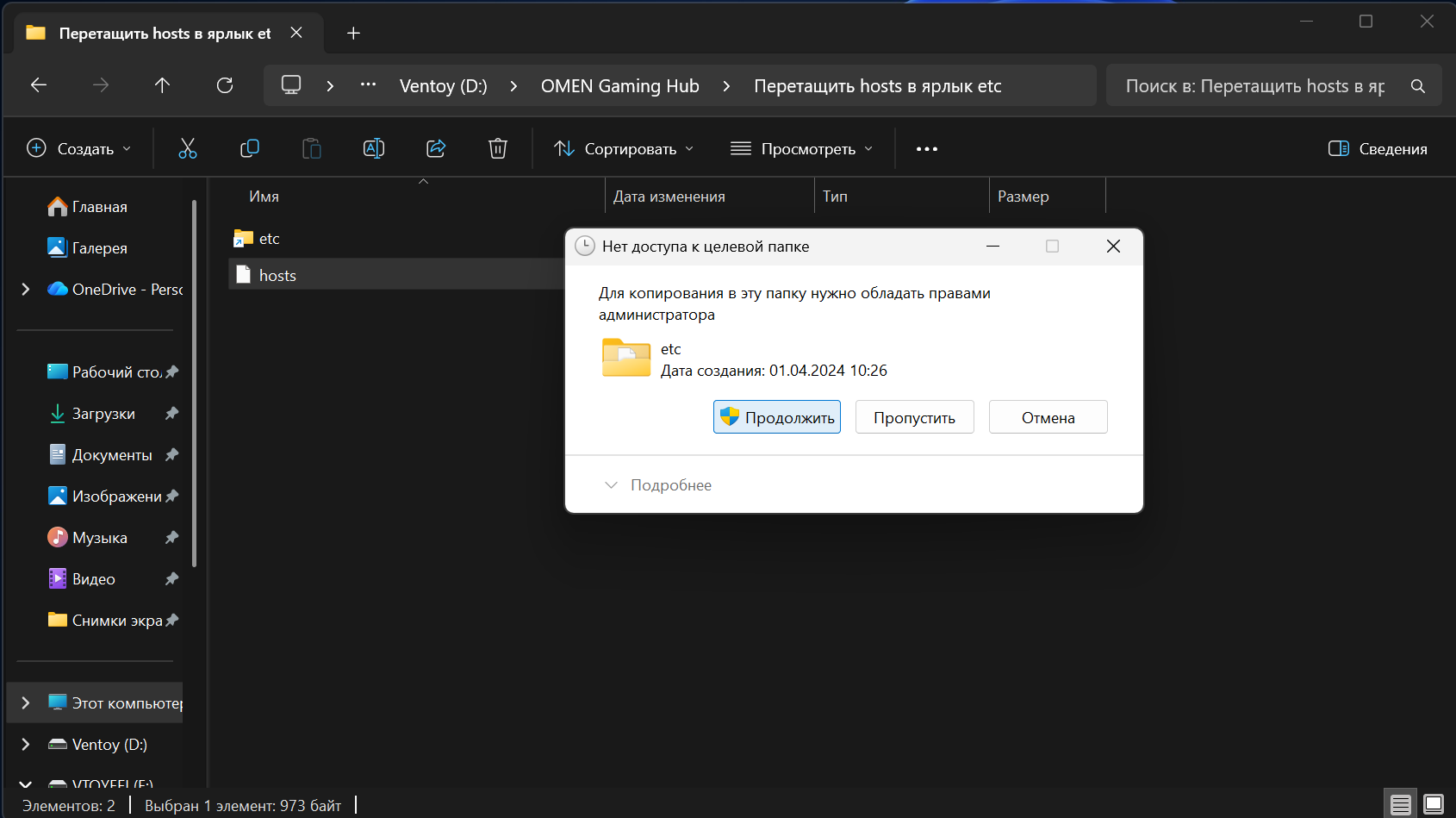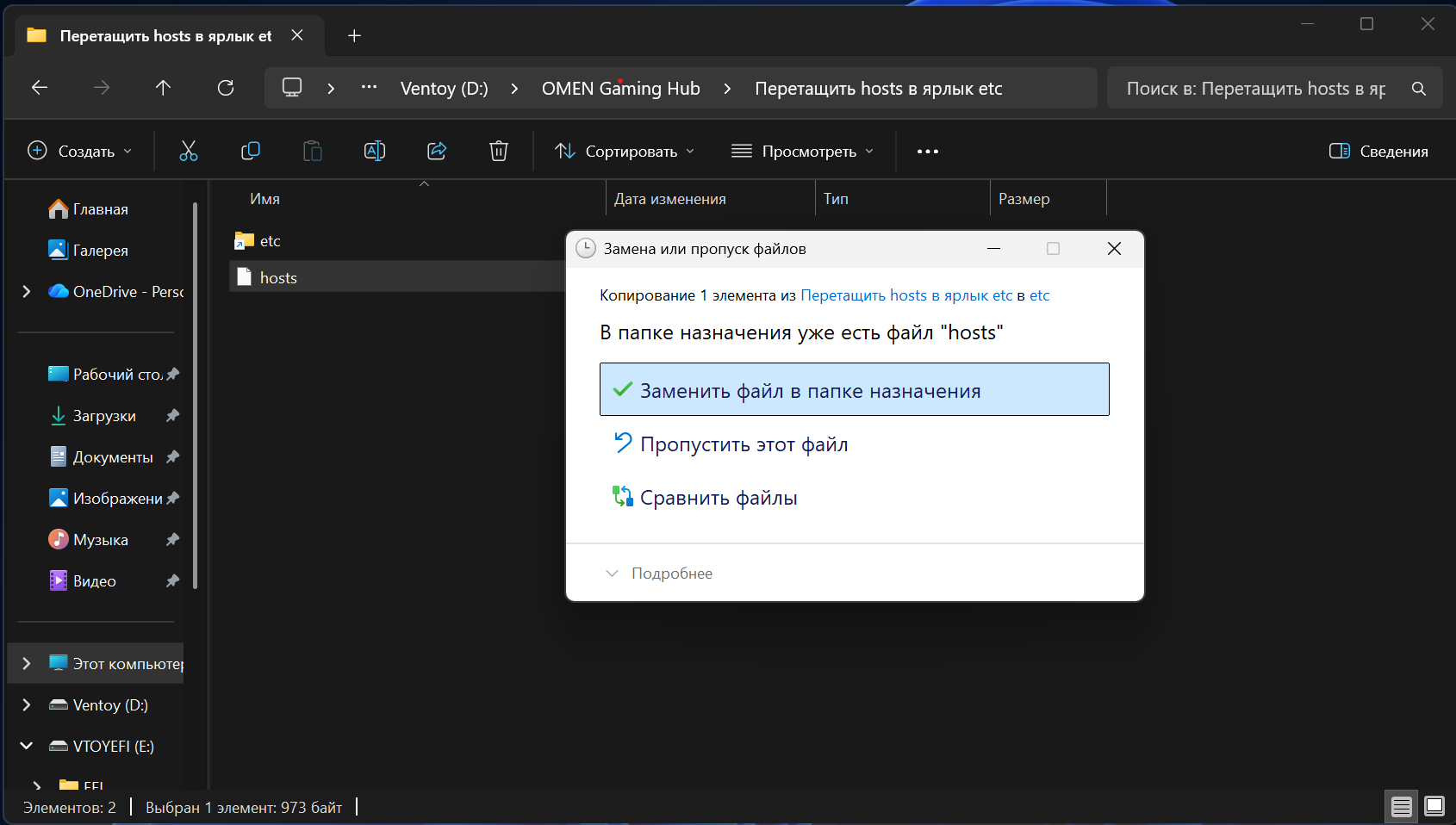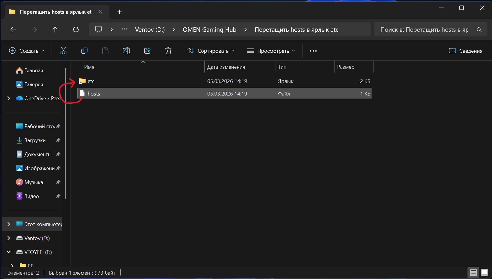 - Дальше переходим в папку «Перетащить hosts в ярлык etc».