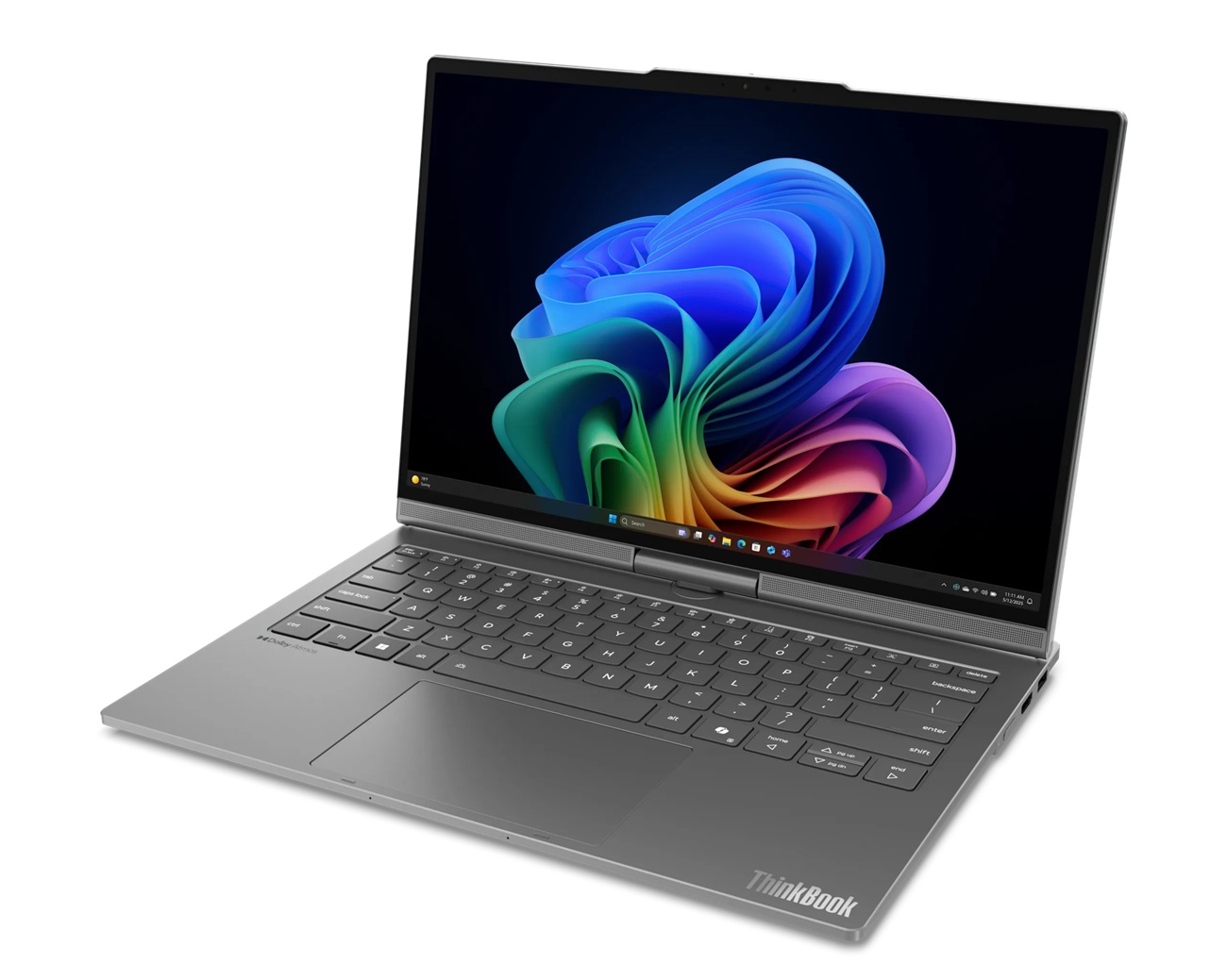 ThinkBook Plus Gen 7 Auto Twist оснащён моторизованным шарниром дисплея, который автоматически поворачивает 14-дюймовый сенсорный 2,8K OLED-дисплей, позволяя устанавливать его в различных положениях.